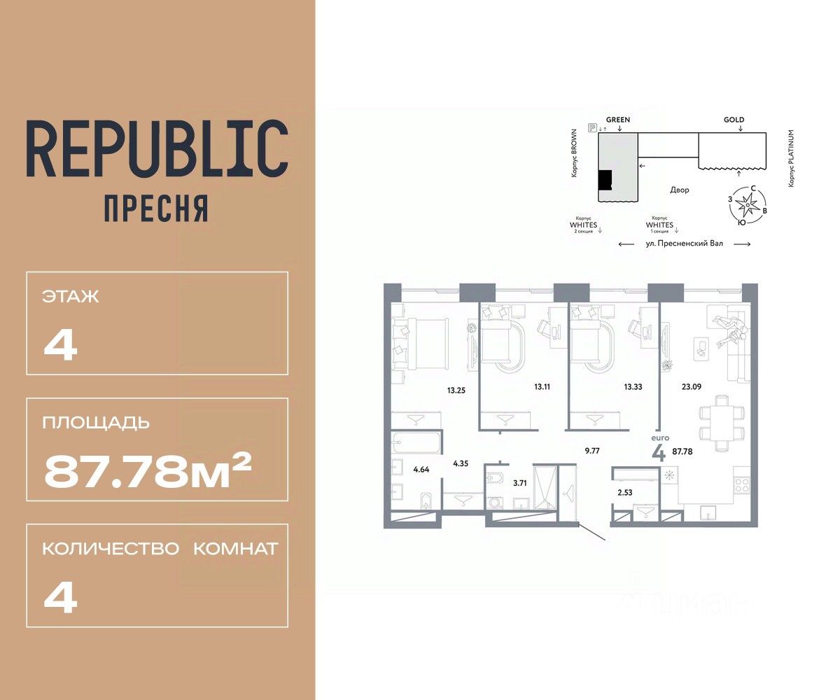 Продается 4комнатная квартира на 4 этаже от застройщика Страна Девелопмент. Площадь квартиры 87,78 кв. м.