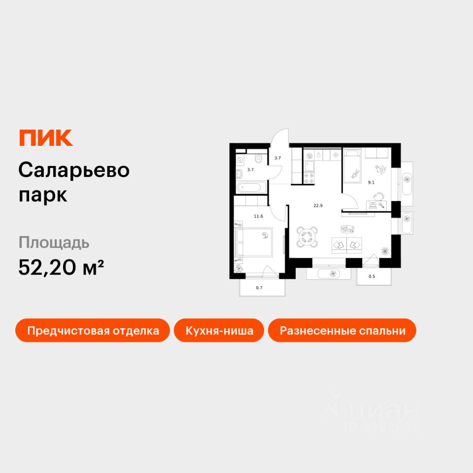 Продаётся 2-комн. квартира площадью 52,2 кв.м на 3 этаже 16 этажного дома (Корпус 57.1, Секция 1) проекта ПИК Саларьево парк. Светлый просторный подъезд на уровне земли, функциональная планировка, большие окна, предчистовая отделка.