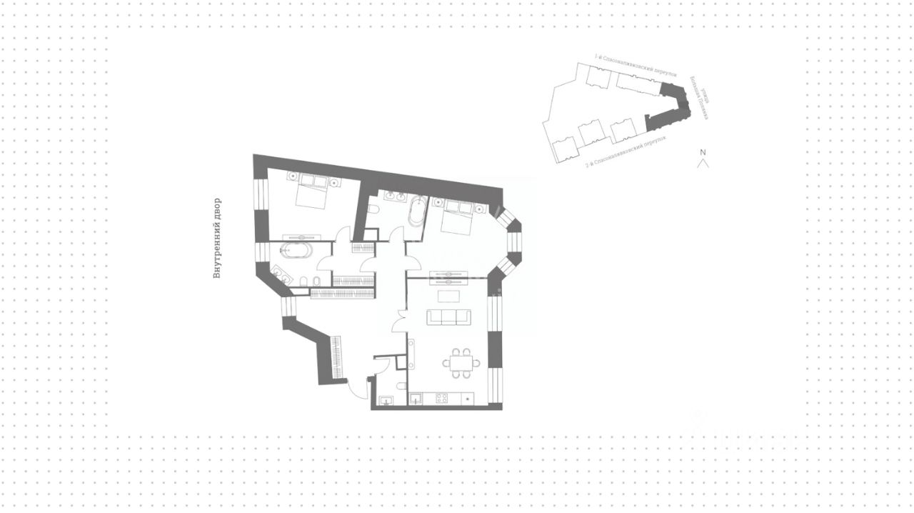 Возможно спланировать кухню-гостиную, мастер-спальню с собственной ванной комнатой и гардеробной либо кабинетом, вторую спальню, ванную комнату, гостевой санузел. Широкоформатные окна ориентированы на две стороны света, открываются виды на благоустроенную территорию комплекса и улицу Большая Полянка.