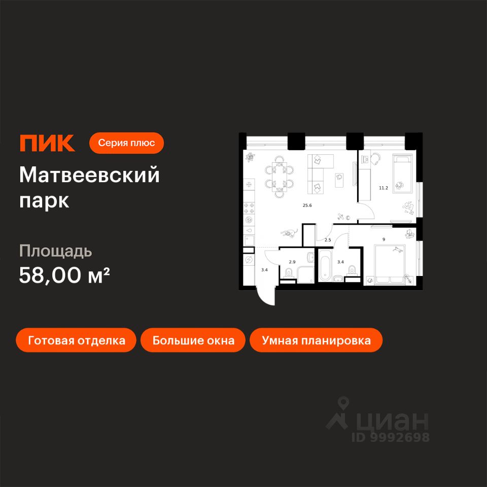 Продаётся 2-комн. квартира площадью 58 кв.м на 14 этаже 15 этажного дома (Корпус 4.2, Секция 2) проекта ПИК Матвеевский парк. Светлый просторный подъезд на уровне земли, функциональная планировка, большие окна, c отделкой.