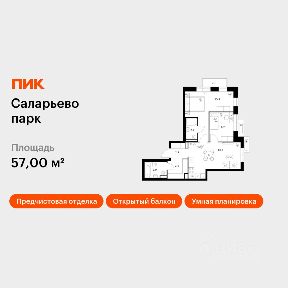 Продаётся 2-комн. квартира площадью 57 кв.м на 9 этаже 22 этажного дома (Корпус 57.3, Секция 3) проекта ПИК Саларьево парк. Светлый просторный подъезд на уровне земли, функциональная планировка, большие окна, предчистовая отделка.