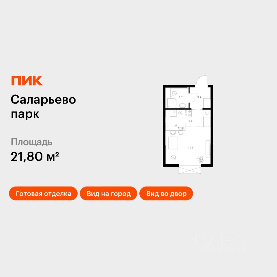 Продаётся квартира-студия площадью 21,8 кв.м на 5 этаже 17 этажного дома (Корпус 20, Секция 1) проекта ПИК Саларьево парк. Светлый просторный подъезд на уровне земли, функциональная планировка, большие окна, c отделкой.