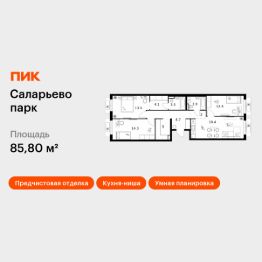 Продаётся 3-комн. квартира площадью 85,8 кв.м на 4 этаже 16 этажного дома (Корпус 57.1, Секция 1) проекта ПИК Саларьево парк. Светлый просторный подъезд на уровне земли, функциональная планировка, большие окна, предчистовая отделка.