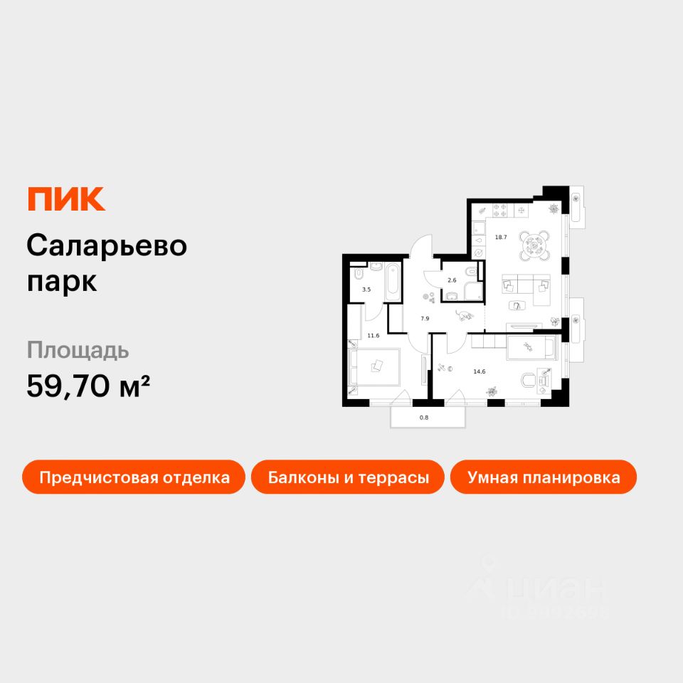 Продаётся 2-комн. квартира площадью 59,7 кв.м на 7 этаже 14 этажного дома (Корпус 57.5, Секция 5) проекта ПИК Саларьево парк. Светлый просторный подъезд на уровне земли, функциональная планировка, большие окна, предчистовая отделка.