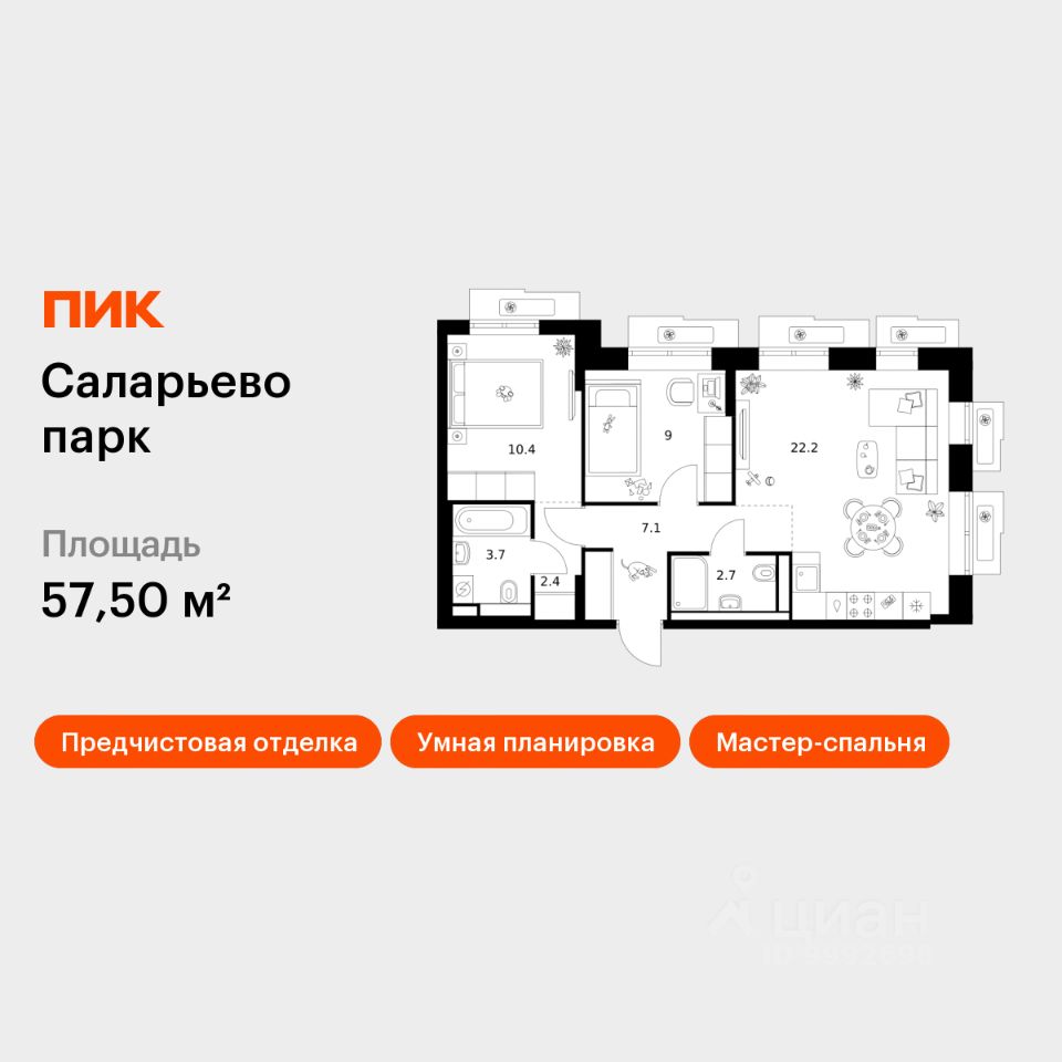 Продаётся 2-комн. квартира площадью 57,5 кв.м на 4 этаже 14 этажного дома (Корпус 57.5, Секция 5) проекта ПИК Саларьево парк. Светлый просторный подъезд на уровне земли, функциональная планировка, большие окна, предчистовая отделка.