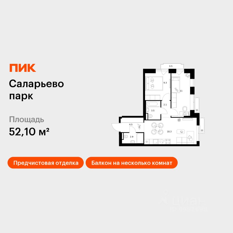 Продаётся 2-комн. квартира площадью 52,1 кв.м на 5 этаже 16 этажного дома (Корпус 57.4, Секция 4) проекта ПИК Саларьево парк. Светлый просторный подъезд на уровне земли, функциональная планировка, большие окна, предчистовая отделка.