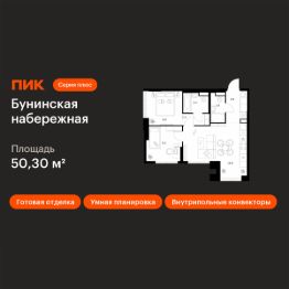 Продаётся 2-комн. квартира площадью 50,3 кв.м на 1 этаже 16 этажного дома (Корпус 2.6/1.1, Секция 1) проекта ПИК Бунинская набережная. Светлый просторный подъезд на уровне земли, функциональная планировка, большие окна, c отделкой.