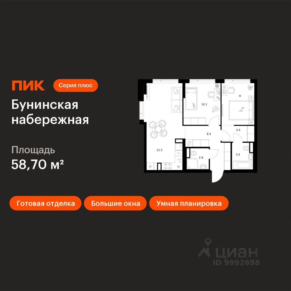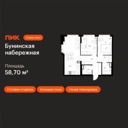 Продаётся 2-комн. квартира площадью 58,7 кв.м на 16 этаже 16 этажного дома (Корпус 2.6/1.4, Секция 4) проекта ПИК Бунинская набережная. Светлый просторный подъезд на уровне земли, функциональная планировка, большие окна, c отделкой.
