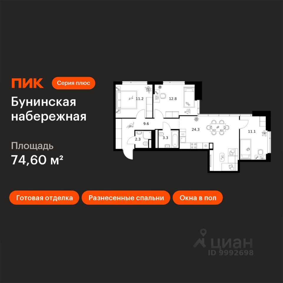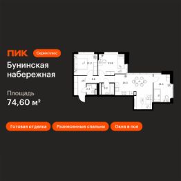 Продаётся 3-комн. квартира площадью 74,6 кв.м на 16 этаже 16 этажного дома (Корпус 2.6/1.3, Секция 3) проекта ПИК Бунинская набережная. Светлый просторный подъезд на уровне земли, функциональная планировка, большие окна, c отделкой.