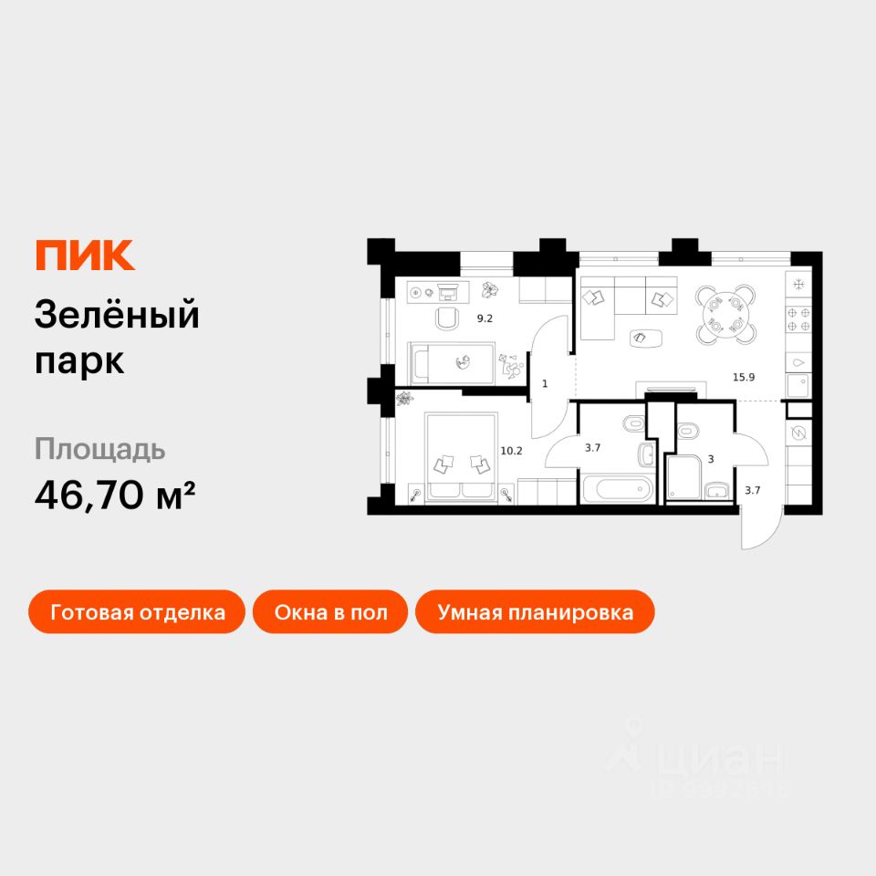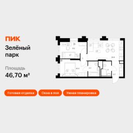 Продаётся 2-комн. квартира площадью 46,7 кв.м на 3 этаже 13 этажного дома (Корпус 5.3, Секция 4) проекта ПИК Зелёный парк. Светлый просторный подъезд на уровне земли, функциональная планировка, большие окна, c отделкой.