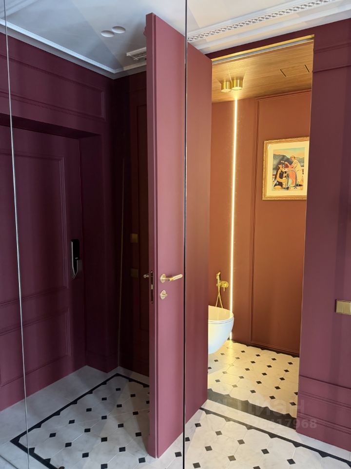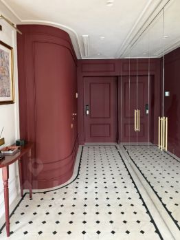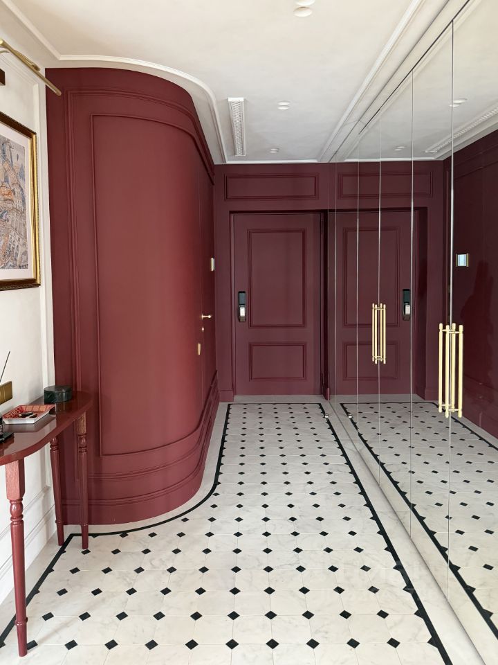 Французская плитка, правильный винный оттенок стен, крупный зеркальный шкаф, выполненный на заказ в бордовом цвете.