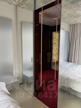 Вся стена напротив окна зеркальная, в неё интегрирована дверь в гардеробную.