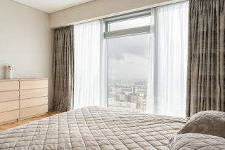В видовой гостиной установлен комфортный диван- место отдыха и релакса от всех забот и суеты. За чашечкой кофе, а по пятницам за рюмкой виски можно наслаждаться изумительными и уникальными видами города. Спальня изолированная с большой двух спальной кроватью и ортопедическим матрацем со своим санузлом . В большом санузле помимо ванной есть душевая кабина.