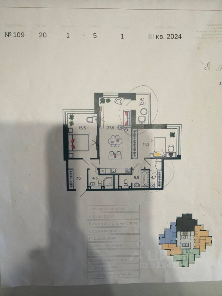 Планировочное решение: просторная кухня-гостиная 27,8 кв.м. с лоджией 4,1 кв.м., две изолированные комнаты 17,3 и 15,5 кв.м. Два санузла. ЕСТЬ ТАКЖЕ КЛАДОВКА 10 кв.м. - на - 2 эт., можно купить отдельно или вместе с квартирой за отдельную стоимость.