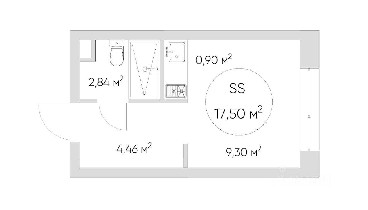 Площадь студии 17,5 кв м.