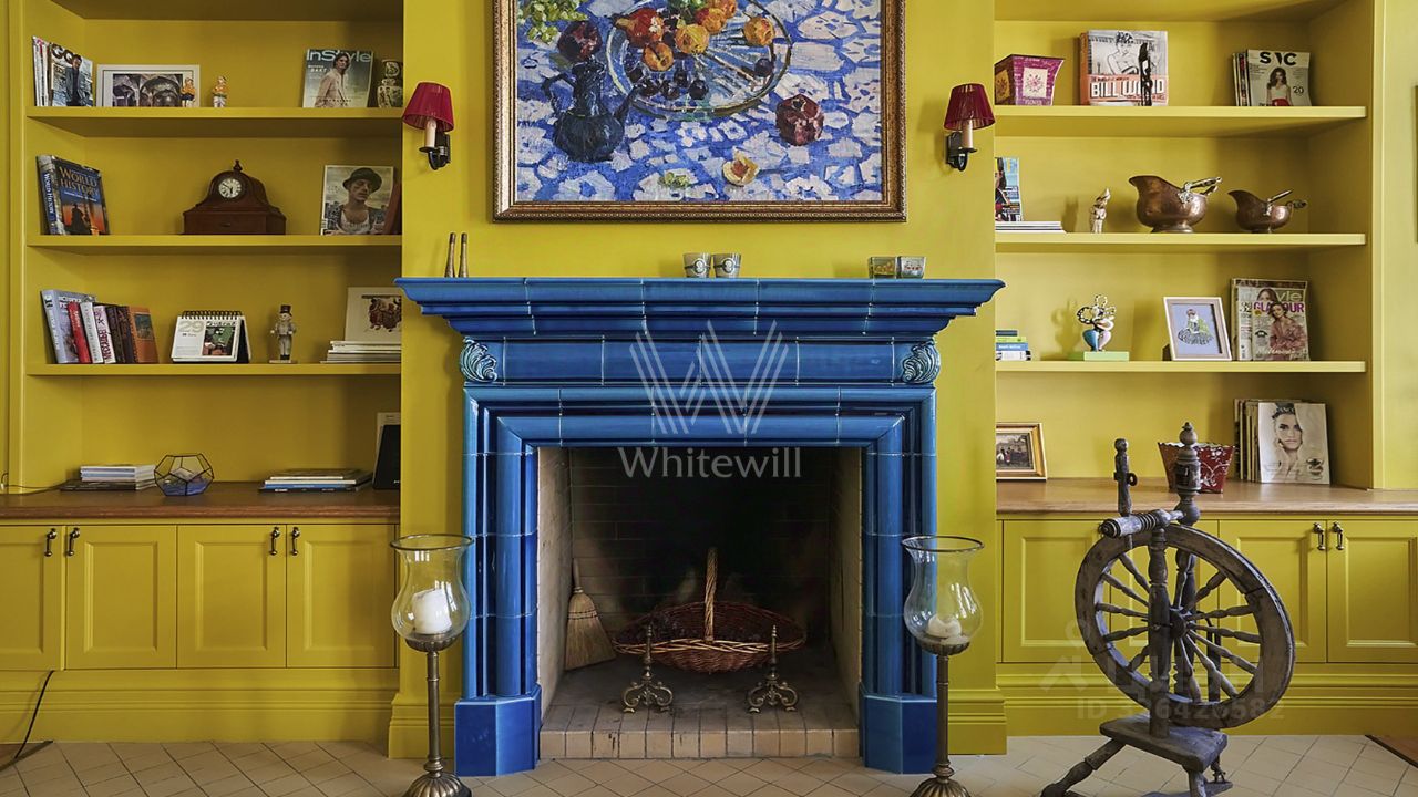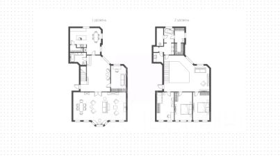 На 1 уровне расположена уютная гостиная с камином и эркерным окном, кухня, просторный холл, кабинет или дополнительная спальня, санузел. Два этажа соединяет широкая деревянная лестница. Планировка 2 уровня включает спальный блок из трёх спален, холл с библиотекой, гардеробную, санузлы. Высота потолков до 6 метров. Окна выходят на две стороны света.