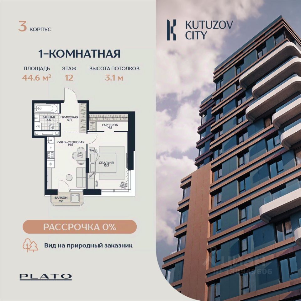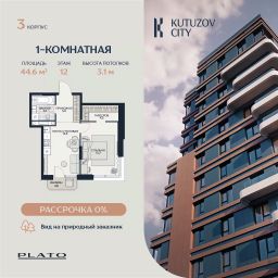 Продаётся светлая однокомнатная квартира площадью 44,6 м² в башне "Созидание" клубного дома "Кутузов Сити". Планировка квартиры продумана до мелочей и позволяет создать комфортное пространство для жизни. Просторная кухня-столовая с панорамными окнами объединяет обеденную зону, кухню и гостиную. Изолированная спальня обеспечивает уединённое пространство для отдыха. Для хранения вещей есть отдельная гардеробная, а также ниша в прихожей. Просторная ванная комната позволяет разместить как душевую кабину, так и большую ванную. Большие окна наполняют квартиру естественным светом и делают интерьер стильным. Высокие потолки придают пространству ощущение свободы и лёгкости. Продуманная планировка позволяет эффективно использовать каждый квадратный метр. О проекте: "Кутузов Сити" — клубный дом на 220 квартир, разработанный совместно с бюро Atrium и Oleg Klodt Architecture & Design. Проект строится в престижном Западном административном округе Москвы, всего в нескольких минутах ходьбы от Кутузовского проспекта. Закрытая территория, приватный двор, подземный паркинг и стильные лобби создают атмосферу комфорта и безопасности. В двух шагах от дома находится крупнейшая природная территория Москвы — природный заказник "Долина реки Сетунь". Камерная застройка и развитая инфраструктура делают "Кутузов Сити" отличным выбором для тех, кто ценит качество жизни и близость к природе. (Лот: 146)