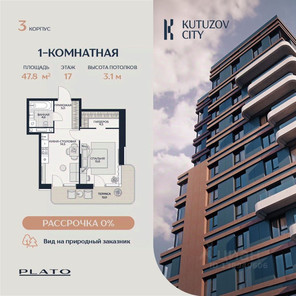 Продаётся светлая однокомнатная квартира евроформата площадью 47,8 м² в башне "Созидание" клубного дома "Кутузов Сити". Планировка квартиры продумана до мелочей и позволяет создать комфортное пространство для жизни. Просторная кухня-столовая с панорамными окнами объединяет обеденную зону, кухню и гостиную. Изолированная спальня обеспечивает уединённое пространство для отдыха. Для хранения вещей есть отдельная гардеробная, а также ниша в прихожей. Просторная ванная комната позволяет разместить как душевую кабину, так и большую ванную. Большие окна наполняют квартиру естественным светом и делают интерьер стильным. Высокие потолки придают пространству ощущение свободы и лёгкости. Продуманная планировка позволяет эффективно использовать каждый квадратный метр. О проекте: "Кутузов Сити" — клубный дом на 220 квартир, разработанный совместно с бюро Atrium и Oleg Klodt Architecture & Design. Проект строится в престижном Западном административном округе Москвы, всего в нескольких минутах ходьбы от Кутузовского проспекта. Закрытая территория, приватный двор, подземный паркинг и стильные лобби создают атмосферу комфорта и безопасности. В двух шагах от дома находится крупнейшая природная территория Москвы — природный заказник "Долина реки Сетунь". Камерная застройка и развитая инфраструктура делают "Кутузов Сити" отличным выбором для тех, кто ценит качество жизни и близость к природе. (Лот: 176)