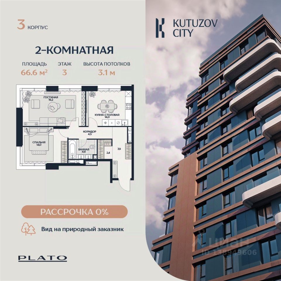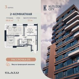 Продается просторная двухкомнатная квартира площадью 66,6 м² в корпусе "Созидание" клубного дома "Кутузов Сити".