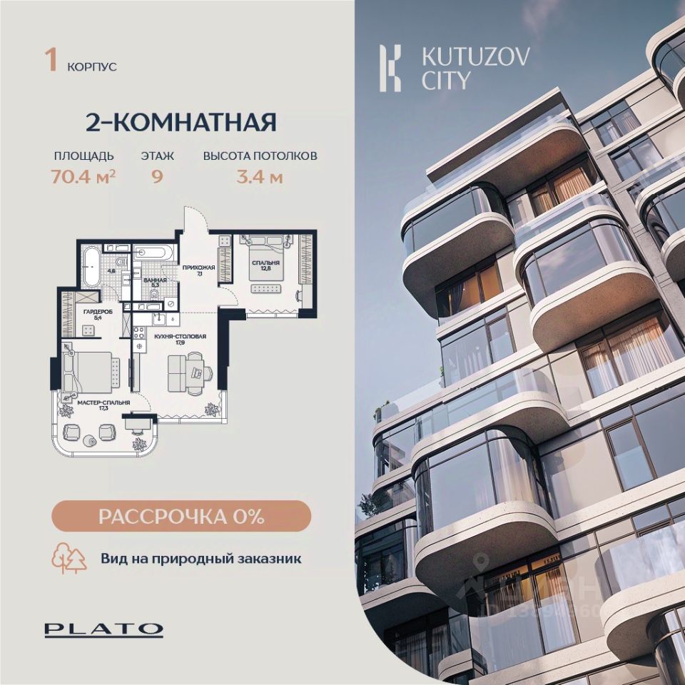 Продаётся просторная двухкомнатная квартира площадью 70,4 м² в башне "Гармония" клубного дома "Кутузов Сити".