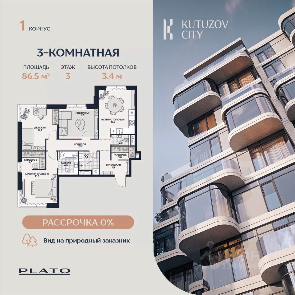 Продается просторная трехкомнатная квартира площадью 86,5 м² в башне "Гармония" клубного дома "Кутузов Сити".