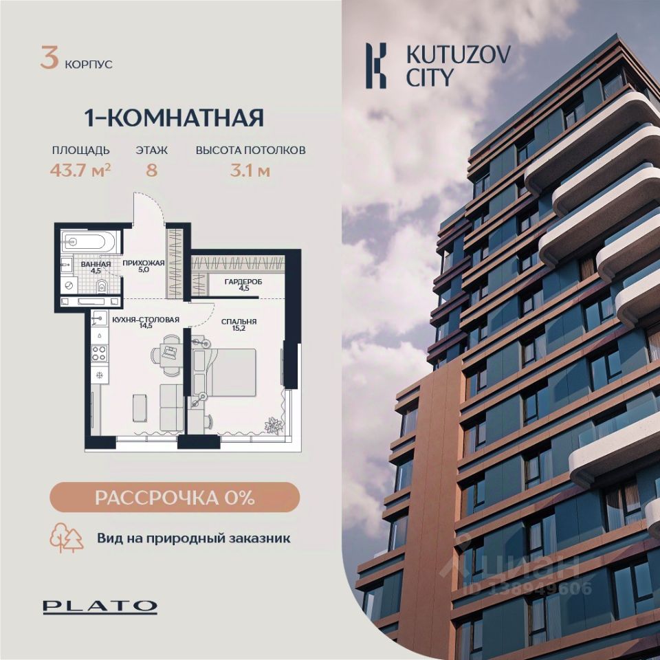 Продаётся светлая однокомнатная квартира евроформата площадью 43,7 м² в башне "Созидание" клубного дома "Кутузов Сити". Планировка квартиры продумана до мелочей и позволяет создать комфортное пространство для жизни. Просторная кухня-столовая с панорамными окнами объединяет обеденную зону, кухню и гостиную. Изолированная спальня обеспечивает уединённое пространство для отдыха. Для хранения вещей есть отдельная гардеробная, а также ниша в прихожей. Просторная ванная комната позволяет разместить как душевую кабину, так и большую ванную. Окна наполнят квартиру естественным светом и делают интерьер стильным. Высокие потолки придают пространству ощущение свободы и лёгкости. Продуманная планировка позволяет эффективно использовать каждый квадратный метр. О проекте: "Кутузов Сити" — клубный дом на 220 квартир, разработанный совместно с бюро Atrium и Oleg Klodt Architecture & Design. Проект строится в престижном Западном административном округе Москвы, всего в нескольких минутах ходьбы от Кутузовского проспекта. Закрытая территория, приватный двор, подземный паркинг и стильные лобби создают атмосферу комфорта и безопасности. В двух шагах от дома находится крупнейшая природная территория Москвы — природный заказник "Долина реки Сетунь". Камерная застройка и развитая инфраструктура делают "Кутузов Сити" отличным выбором для тех, кто ценит качество жизни и близость к природе. (Лот: 122)