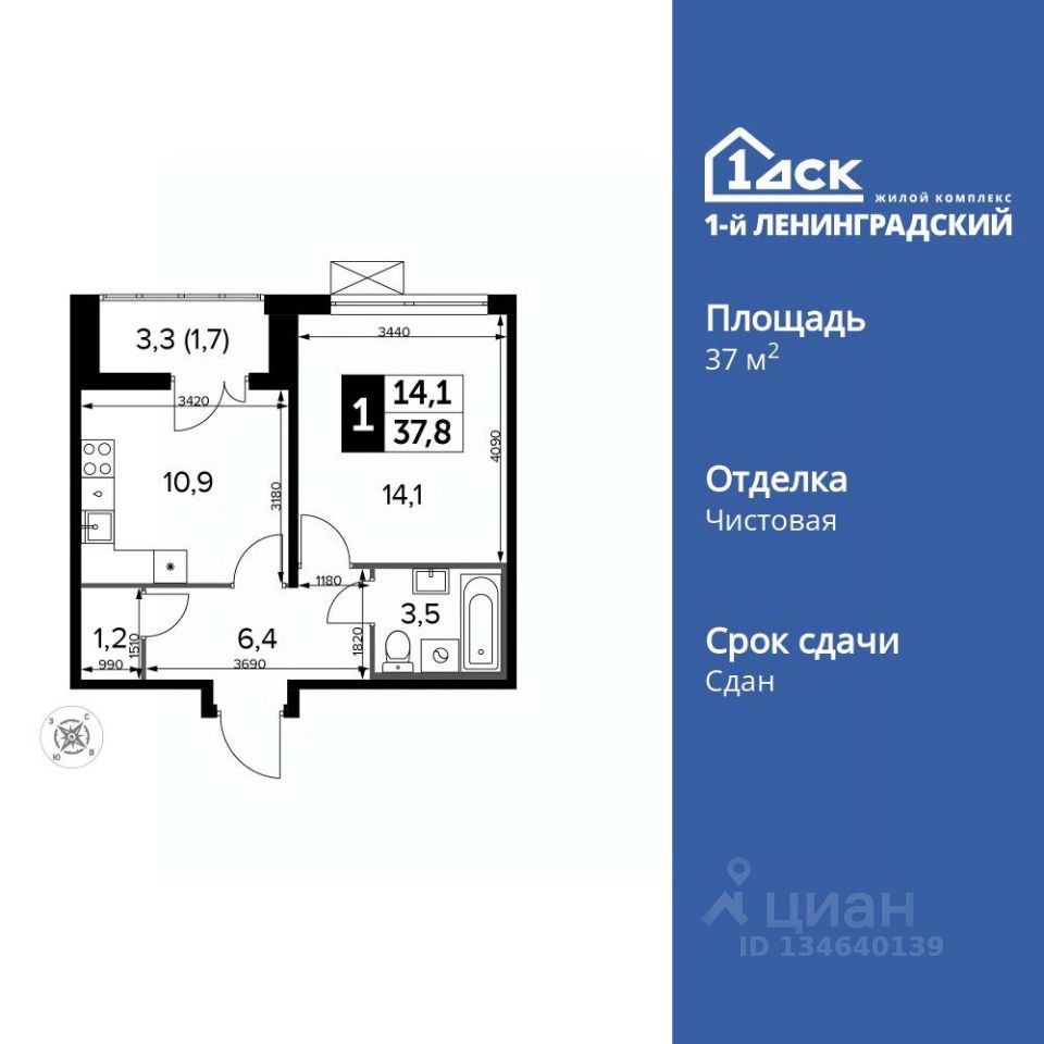 Продаётся 1-к квартира номер 420 общей площадью 37.8 кв.м. на 2-м этаже 12 этажного здания. Чистовая отделка. Цена с учётом скидки.