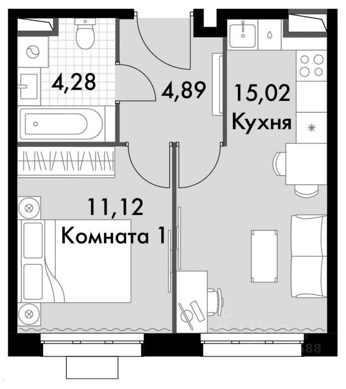 Планировка квартиры максимально удобная: большая кухня (15,02 м²), которую легко можно превратить в кухню-гостиную, отдельная комната, просторный санузел и функциональная прихожая — без лишних "съеденных" метров.