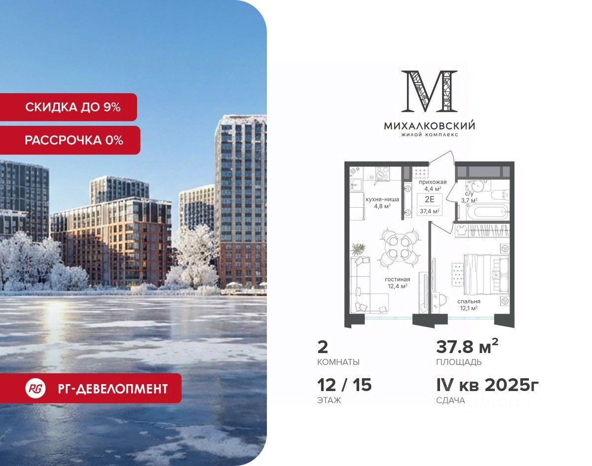 Продаётся 2-к квартира 37,8 кв.м. в ЖК "Михалковский" на 12-м этаже 15 этажного дома.