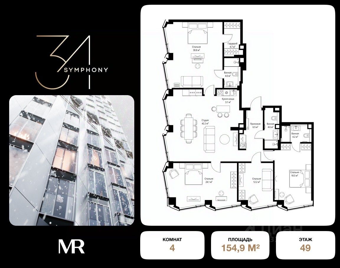 В продаже 4-комнатная квартира площадью 154.90 м² с предчистовой отделкой на 49 этаже 49 этажного дома в корпусе Кристал.