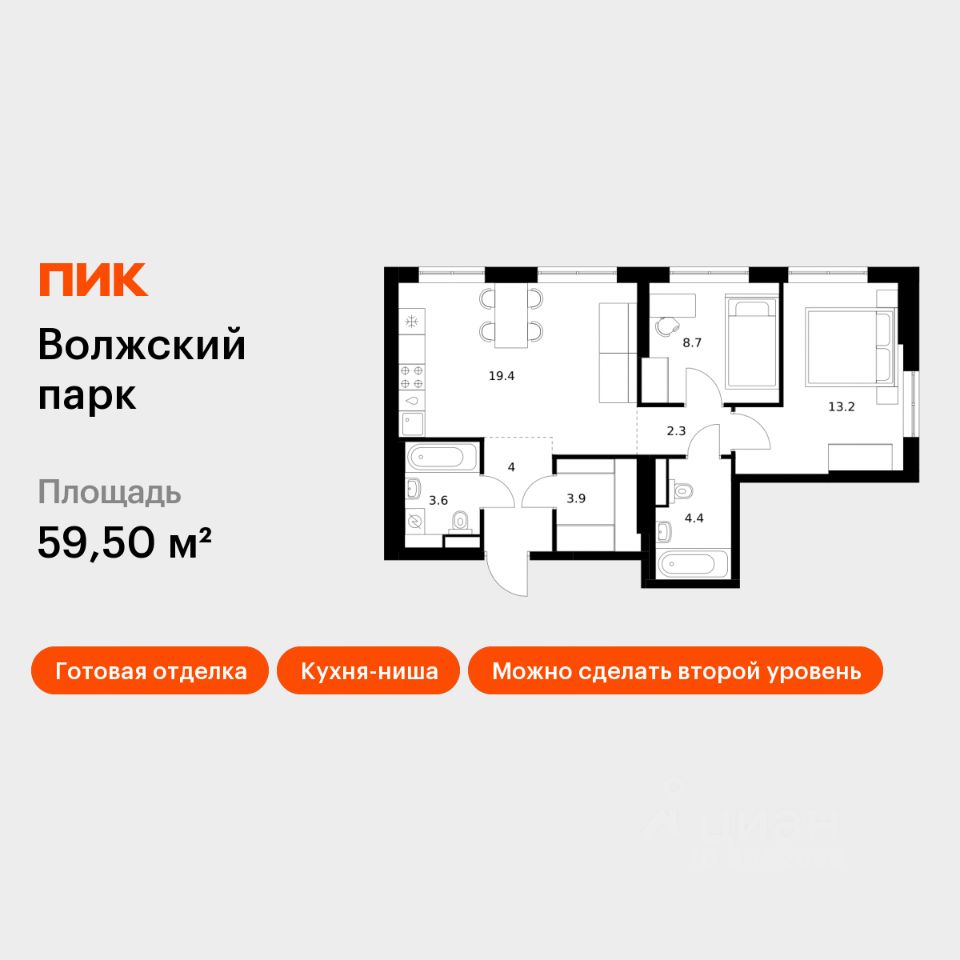 Продаётся 2-комн. квартира площадью 59,5 кв.м на 1 этаже 24 этажного дома (Корпус 6.2, Секция 1) проекта ПИК Волжский парк. Светлый просторный подъезд на уровне земли, функциональная планировка, большие окна, c отделкой.