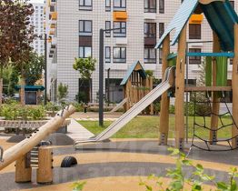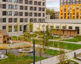 В проекте предусмотрена медленная зона для электросамокатов — с 7 утра до полуночи при въезде на территорию квартала скорость электросамокатов автоматически снижается до 15 км/ч. Артикул 976385 (Застройщик АО "Специализированный застройщик "Волжский парк"")