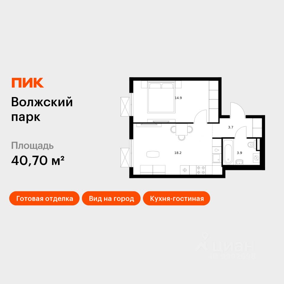 Продаётся 1-комн. квартира площадью 40,7 кв.м на 19 этаже 24 этажного дома (Корпус 6.2, Секция 1) проекта ПИК Волжский парк. Светлый просторный подъезд на уровне земли, функциональная планировка, большие окна, c отделкой.
