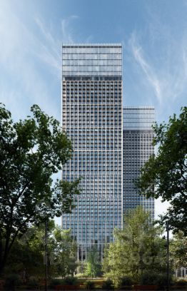 * Башни, увенчанные стеклянными коронами, и натуральный камень в отделке фасадов.