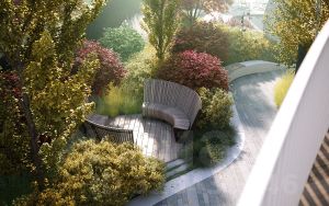 * Двухуровневое благоустройство с парящим мостом, детскими и спортивными площадками, фонтанами и уютными зонами для общения.
