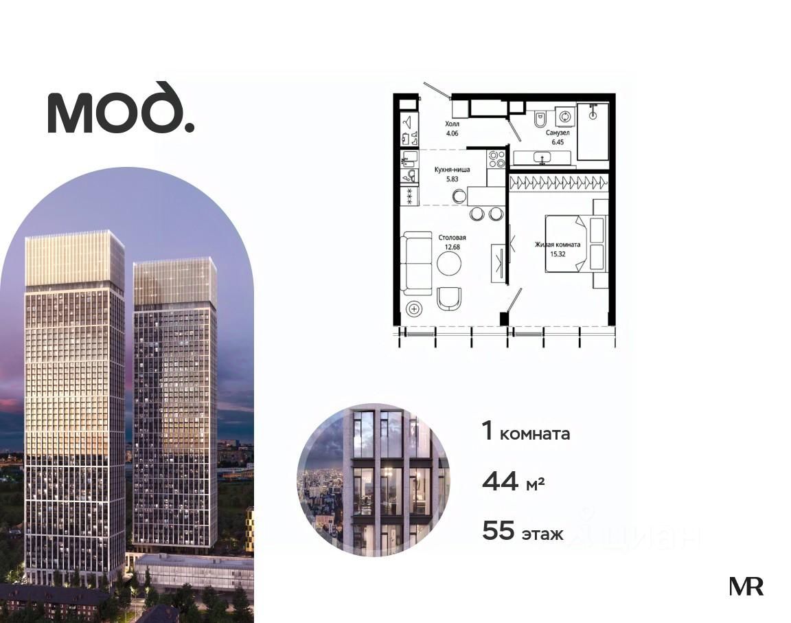 Продается 1-комнатная квартира общей площадью 44 м² без отделки в ЖК премиум-класса Мод на 55-м этаже 55 этажного дома.