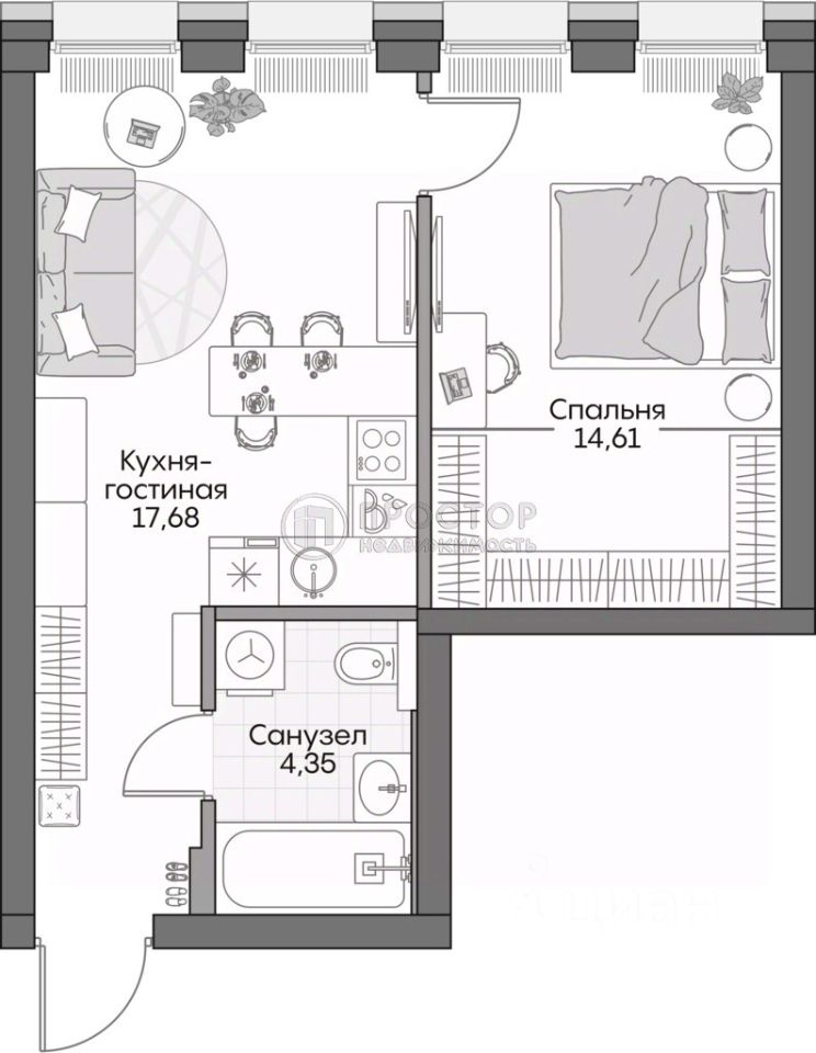 Европланировка: просторная кухня-гостиная 14, 3 кв. м и спальная комната 12.7 кв.м , 4 панорамных окна в пол с видами на набережную Москвы-реки.