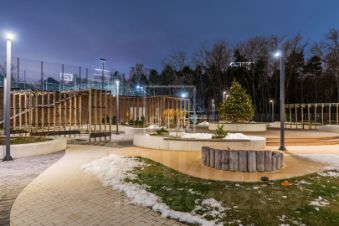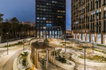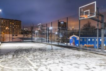 Двор: внутренний двор разделяется на детскую и лаунж-зону с деревянными перголами и гамаками и качелями для отдыха. Для спорта предусмотрена зона воркаута и баскетбольная площадка.