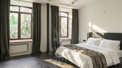 Апартамент полностью укомплектован мебелью, кухня оснащена встроенной техникой Miele, Smeg. Для каждого этажа предусмотрена возможность отдельного входа. В квартире две кухни — в столовой и гостиной. Высота потолков в цоколе 3,1 метра, на 1 уровне 4,5 метра. Окна с видом в уютный внутренний двор.
