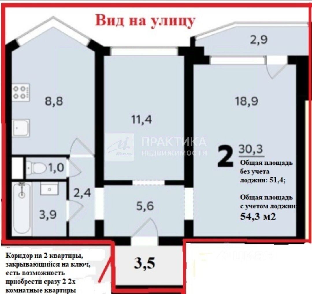 Общая площадь: по документам 51,4м2 (с учётом застеклённой лоджии 54,3 м2).
