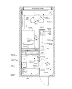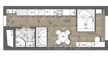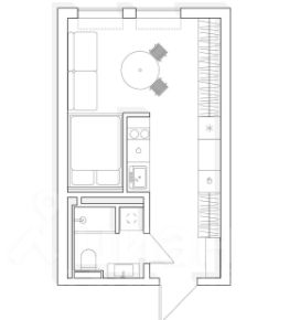 Самая удачная планировка и вид из окон. Окна располагаются по центру квартиры, что даёт возможность расположить по обе стороны от окон шкафы. Апартаменты без отделки. Квартира достаточно широкая, это позволяет максимально эффективно использовать пространство. В студии возможно расположить полноценную спальную зону с двуспальной кроватью, при этом останется место для зоны гостиной с диваном и столом. при такой планировке кухня располагается в проходе, что не снижает её удобство и функциональность, но отделяет от других зон. Варианты такой планировки вы можете посмотреть на фото.