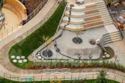В центральной части парка расположен амфитеатр со сценой для представлений и проведения мероприятий. Для гармоничного развития маленьких жителей - пространства по стандарту Kid`s Lab для гармоничного развития детей всех возрастов: детская площадка, игровая комната, рельефная площадка для общения со сверстниками, где можно заниматься паркуром, танцевать и играть в настольный теннис.