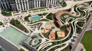 В центральной части парка расположен амфитеатр со сценой для представлений и проведения мероприятий. Для гармоничного развития маленьких жителей - пространства по стандарту Kid`s Lab для гармоничного развития детей всех возрастов: детская площадка, игровая комната, рельефная площадка для общения со сверстниками, где можно заниматься паркуром, танцевать и играть в настольный теннис.