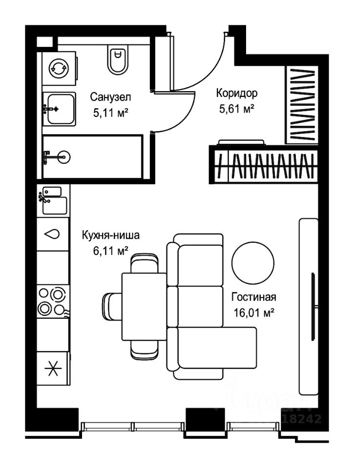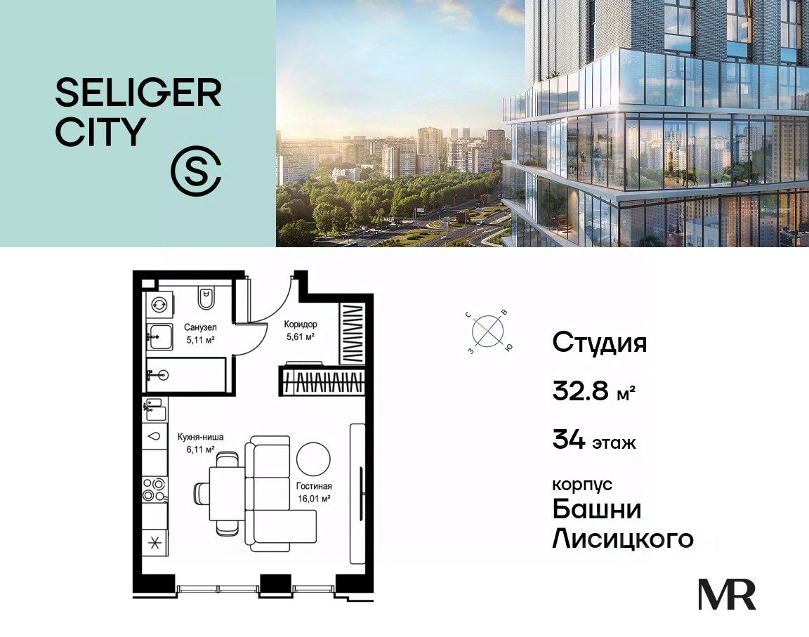 Продаётся студия общей площадью 32.84 м² без отделки в ЖК "Селигер Сити" на 34-м этаже башни Лисицкого.