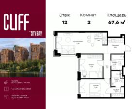Продаётся 2-комнатная квартира общей площадью 67.55 м² с предчистовой отделкой в ЖК City Вау, квартале Cliff, на 12-м этаже 15 этажного дома.