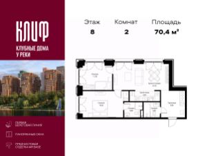 Продаётся 2-комнатная квартира общей площадью 70.38 м² с предчистовой отделкой в ЖК Сити Бэй, квартале Клиф, на 8-м этаже 15 этажного дома.