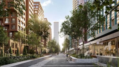 Со стороны южного фасада, обращенного к воде, находится прогулочная зона, организующая входы в жилые секции. Вдоль северного фасада пятой очереди проходит общеквартальный озелененный бульвар с тематическими зонами и дворовыми территориями. В каждой секции предусмотрены сквозные входные группы, а между секциями - проходы для пешеходов, связывающие набережную и бульвар с местами для отдыха внутри квартала. Данное решение позволяет сделать комплекс с доступной и безбарьерной городской средой.