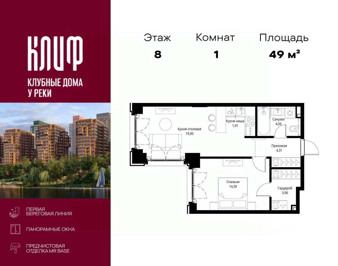 Продаётся 1-комнатная квартира общей площадью 48.99 м² с предчистовой отделкой в ЖК Сити Бэй, квартале Клиф, на 8-м этаже 15 этажного дома.
