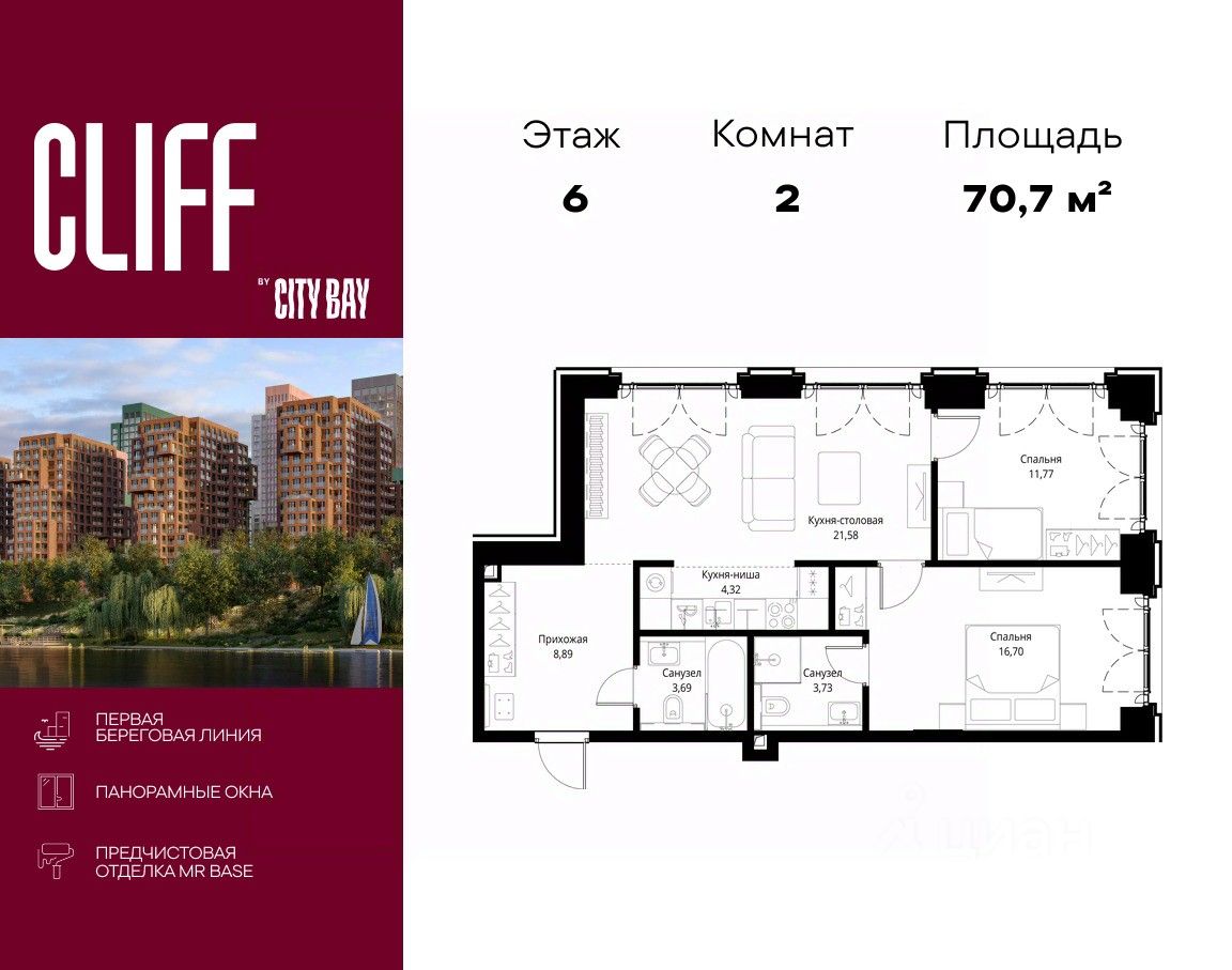 Продаётся 2-комнатная квартира общей площадью 70.68 м² с предчистовой отделкой в ЖК City Вау, квартале Cliff, на 6-м этаже 15 этажного дома.