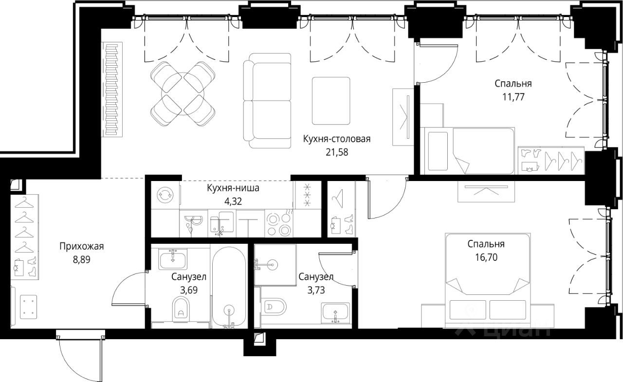 В каждом здании комбинируется максимальное количество и разнообразие форматов квартир: от видовых квартир с зелеными террасами и лоджиями до квартир малого формата.